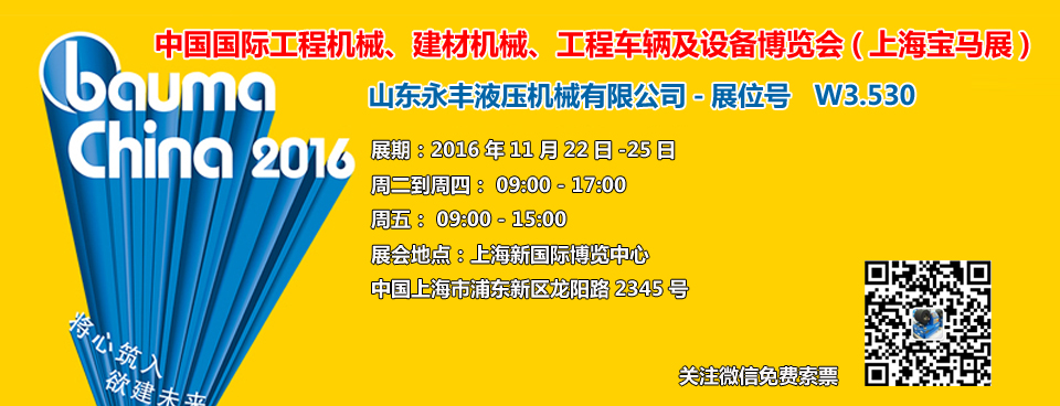 山東永豐液壓機械有限公司將于今年11月參加上海bauma China 2016(上海寶馬展)展會,歡迎廣大新老朋友屆時蒞臨指導,免費索票。