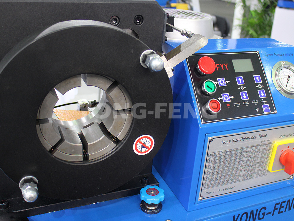 從液壓油管扣壓參數(shù)表中查得Ф19mm四層鋼絲膠管接頭外套外徑扣壓前為37mm,扣壓后為33.5mm,應選用的模具內(nèi)徑為Ф33mm,對應千分尺刻度為3。安裝好Ф33mm模具于模座上,并將千分尺刻度旋至3處,將膠管剝皮后與接頭組裝好。扣壓完畢后測量接頭外套外徑就是扣壓參數(shù)表的扣壓后數(shù)值33.5mm,則完成扣壓。如扣壓后外徑不符,微調千分尺后扣壓下一根膠管??蹓耗z管接頭時:扣壓尺寸過多,膠管內(nèi)膠層被壓斷,造成漏油;扣壓尺寸太少,造成漏油和被油壓沖脫接頭。務必掌握合理扣壓度,以接頭芯子內(nèi)孔收縮度為準,國標接頭受壓縮小0.1~0.4mm,普通接頭受壓縮小0.1~2mm。因膠管及接頭外套的生產(chǎn)廠家不同,如北方大多數(shù)膠管生產(chǎn)廠用GB標準,南方用602標準,國外SAE標準,各廠膠管、接頭的具體尺寸、材質可能不盡相同,因此扣壓參數(shù)表數(shù)據(jù)僅供參考,具體扣壓尺寸應以壓力實驗為依據(jù)。